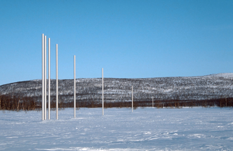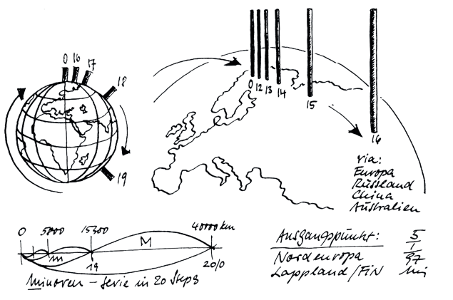 the route: starting point is in ropinsalmi in finnish lapland near the border to sweden and north of the arctic circle (the first column does not only pierce the earth at this point, but the cell of life or for instance the smallest atom in it's ground state which can be divided further - microcosms). the route continues further in an angle of 74.54° in north-easterly direction with 10 steps, which man could see with his own eyes and possibly point 11. point 12 is situated on the finnish side. point 13 and 14 in the kautokeino district of lapland/ norway. point 15 is located in russia, near pitkajarvi on the mountain shuort. point 16 re aches the barents sea. point 17 the area southwest of the town noryj urengoj/ siberia/russia. point 18 baotou/inner-mongolia/ china, very close to the great wall. point 19 reaches the southern part of australia, 60 km south of melbourne. further over the antarctica, where the first and the last steps fuse, (birth and death become one), over south-america and lastly over sweden back to the starting point 20 in ropinsalmi in finland. the journey is complete. (a indication of a limitless universe - macrocosms)