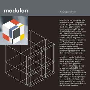 Modulon - a cube divided into the dimensions of the golden mean. The golden mean is achieved with a geometric construction (see illustration) that has a divisor of approximately 0.618 (the shorter part of a line segment has the same relationship to the longer part as does the longer part to the whole). 16 building blocks of seven different masses can be arranged to form many different proportions according to the harmonic principle.