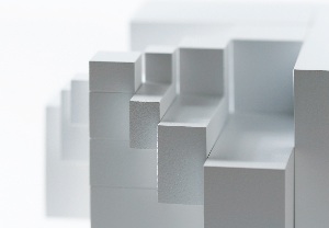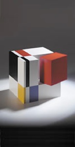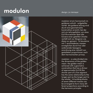 Modulon by Jo Niemeyer - a cube divided into the dimensions of the golden mean. The golden mean is achieved with a geometric construction (see illustration) that has a divisor of approximately 0.618 (the shorter part of a line segment has the same relationship to the longer part as does the longer part to the whole). 16 building blocks of seven different sizes can be arranged to forms in many different ways according to the harmonic principle.