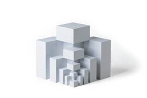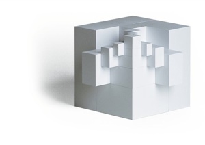 This cube is divided several times in adherence to the golden ratio and surrounded by black shapes. During play, these become foundations, walls or roofs and a player the architect. Everything fits into each other harmoniously.